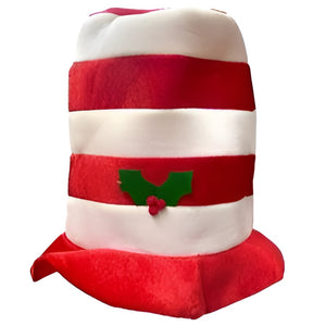 Festive striped top hat with holly accent! Features: Red and white candy cane stripes, Decorative holly leaf and berry detail, Plush velvet material, Comfortable elastic band. Perfect for Christmas parties and performances.